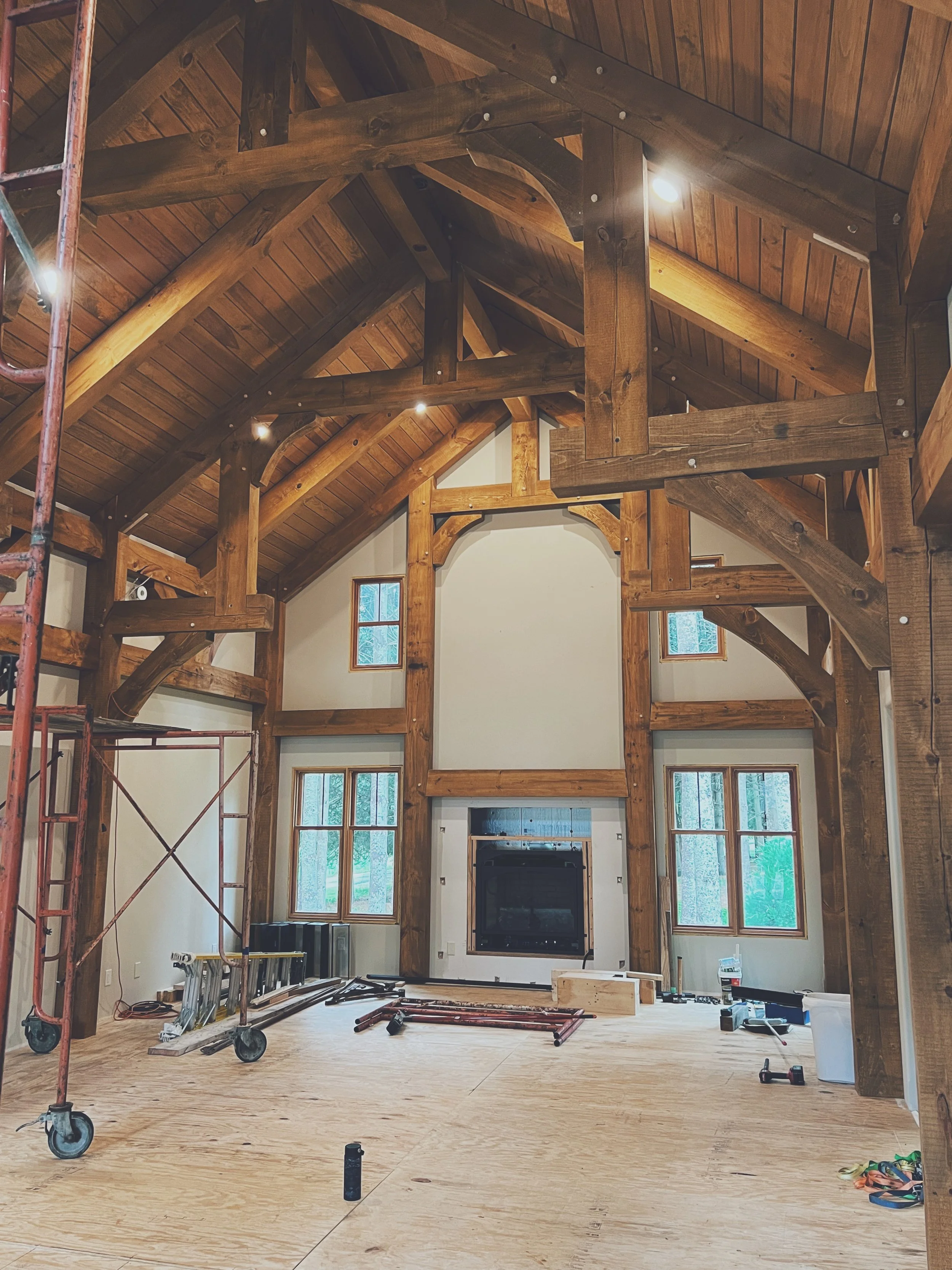 Because apparently we cannot do anything simple to save our life, our second timber frame was another unique challenge. We were approached by a couple who had initially had their new house designed to be partially timber framed, only for the company to go out of business before the onset of construction. The couple modified the plans and built their house conventionally, with the hopes of being able to bring their timber framed great room to life at some point in the future. They managed to find us while we were finishing up on the Stagecoach project and it seemed like a great fit. They needed timber framers, and we were more than up for the challenge!